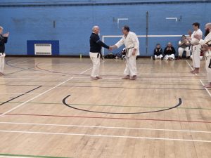 After the three-hour seminar, his grading took another hour and we were delighted when his name was called out and his black belt was awarded to him!